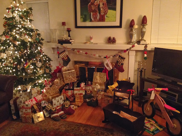Once we got home we sat down and read the Christmas story from the scriptures. Since our kids are young I thought it would be good to also show a video. There are a bunch of great ones you can find online, I used the one with scenes from the Natvity mixed with the song Breath of Heaven. Then is was time to send everyone off to bed. Lilliana however did not fall asleep until around 11pm. So we waited….While we waited I made quiche and cinnamon rolls for breakfast the next morning. When she was finally asleep it was time to get to work. We got all the presents out and arranged (I had not put ANY gifts under the tree until that night). I also had to build Camille's bike, the baby highchair and cradle for Allison. I finally finished around 2am. I was sure hoping the kids would sleep in...
